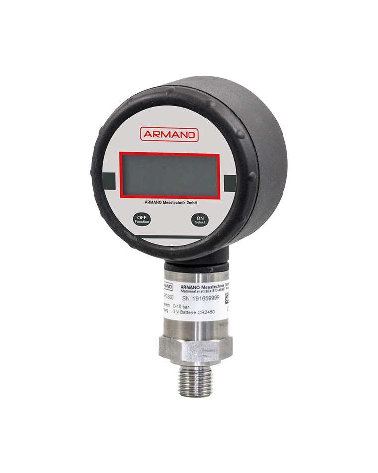 The battery-operated digital pressure gauge DPG 300 is suitable for measuring and monitoring positive pressures of liquid and gaseous media for pressure ranges from 0 – 1.6 bar to 0 – 250 bar. A ceramic sensor serves as measuring element. The rotatable case is made of polycarbonate and has the degree of protection IP65. The digital pressure gauge is equipped with an integrated rotatable 4 1⁄2 digit display.A unit conversion for widespread units (bar, psi, Pa, MPa) has been integrated into the DPG 300. Additional functions are auto zero, min. / max. value with reset function, and an automatic switchoff.